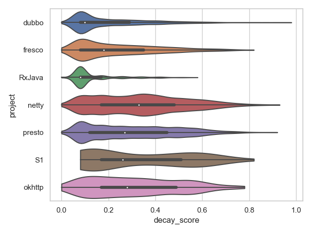 The figure above provides a violin plot that illustrates the distribution of decay scores per system. As we can observe, there is a significant difference between how slightly- and largely-decayed classes behave in terms of score. The group of former classes (i.e., in the lower quartile of decay score, presented in the graph) was densely grouped, which means they share similarities in the amount of IQAs that have deteriorated. On the other hand, the latter classes were more sparse, showing that the IQAs decayed in a more varied degree.